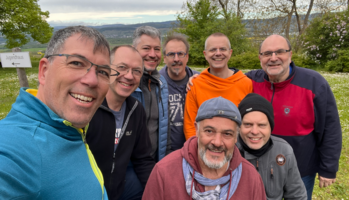 Ehemalige Ehrenamtliche und ehemalige Teilnehmer sind gemeinsam unterwegs auf dem EJW Männer-Wochenende im Kloster Jakobsberg