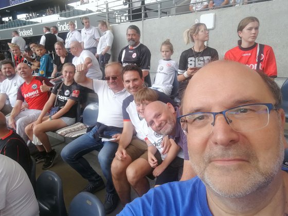 Über 20 junge und ältere Personen haben am Mittwochabend das Abschiedsspiel von Alex Meier im Waldstadion erlebt. Vielen Dank für die Freikarten, Axel Hellmann, Vorstandssprecher von Eintracht Frankfurt. Der Abend hat uns viel Spaß bereitet. Mit dabei waren junge werdende Mitarbeiter*innen, aktive Mitarbeitende, einige ganze Familien, ein befreundeter Pfarrer mit Sohn und Freund mit Sohn. Schön war auch die Begegnung mit Marc Reinmann, der mit mir in den 80ger Jahren gemeinsam in Värnamo auf einer Schweden-Freizeit war. Über Facebook sind wir schon seit Jahren in Kontakt, jetzt haben wir uns nach über 30 Jahren im Waldstadion wiedergesehen. Wieder ein kleines EJW Ehemaligentreffen, diesmal im Waldstadion. Vielen Dank für die gemeinsame Zeit, die kurzen Gespräche, 16 Tore, 6 davon von Alex Meier "Fußballgott". Euer Hans-Conrad Blendermann (im Lebendigen Ruhestand)