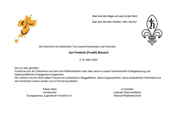 Freddi hat sich als Teilnehmer und dann als Pfadfinderführer über viele Jahre in unsere Gemeinschaft mit Begeisterung und leidenschaftlichem Engagement eingebracht. Wir verlieren mit ihm einen lieben Freund und verlässlichen Weggefährten. Seine Zugewandtheit, seine ansteckende Fröhlichkeit und sein herzliches Lachen werden uns in Erinnerung bleiben.