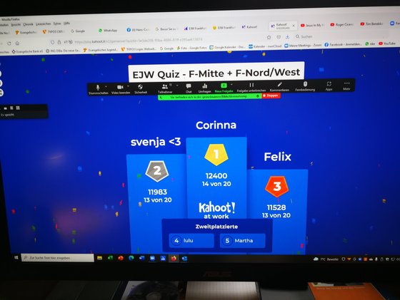 Mit Mentimeter, Padlet und Kahoot haben wir gestern gearbeitet und die Mitarbeitenden der beiden EJW Arbeitsbereiche Frankfurt Mitte und Frankfurt Nord/West sind sich näher gekommen. Mit Umfragen, Übersichten mit wichtigen Infos und einen schönen Quiz zum Abschluss haben wir uns gestern am Sonntag zwei Stunden lang online getroffen. Es gibt Unterschiede in den beiden Mitarbeitergruppen, aber auch innerhalb der M-Gruppen gibt es eine große Vielfalt von jungen engagierten Menschen. Wir haben das "Mut zum Wir" und gestern haben wir uns gemeinsam auf den Weg gemacht. Wichtig ist noch einmal zu sagen, dass das EJW Frankfurt aus finanziellen Gründen, weil wir immer weniger Finanzen für hauptamtliche Stellen in Frankfurt erhalten, die beiden Arbeitsbereiche in Zukunft, nach dem Weggang von Britta Meyer (Januar) und Hans-Conrad Blendermann (lebendiger Ruhestand ab Juni) nur eine*n Hauptamtliche*n erhalten werden. Das wird neben dem Zusammenwachsen beider Arbeitsbereichen eine besondere Herausforderung. Und wird sich natürlich auch auf die Arbeit vor Ort in den Gemeinden auswirken. Aber wir geben unser Bestes für eine lebendige Kinder- und Jugendarbeit in Frankfurt mit Glauben, Gemeinschaft und Begeisterung. Hans-Conrad Blendermann (EJW Jugendreferent in F-Nord/West und F-Mitte) PS: Die bestplazierten beim Kahoot - Quiz: Platz 3: Felix // Platz 2 Svenja // Platz 1: Corina - herzlichen Glückwunsch
