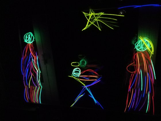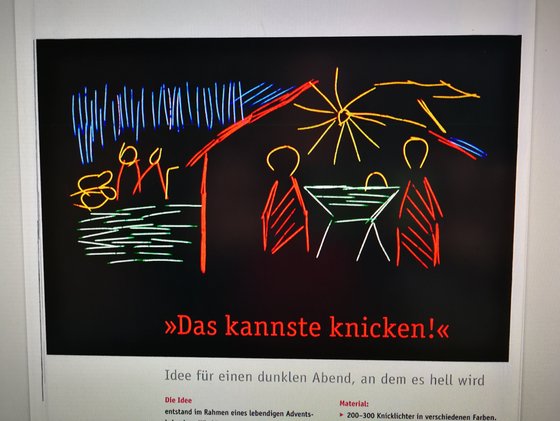 In den vier Kleingruppen wurden tolle Weihnachts - Bilder gestaltet. Vielen Dank ihr lieben Konfis aus Hausen und Praunheim für Eure kreativen Bilder. -- Mit stillen Gesprächen, einem passenden Weihnachts -Anspiel, aktuellen Bildern, die Weihnachten symbolisieren und einigen Fragen über Jesus 2021: Wie wäre es, wenn Jesus heute auf die Welt käme ... ? "Das kannste knicken!" Und dann werden wir die Weihnachtsgeschichte mit Knicklichtern darstellen ... - wir wollen kreative Ideen umsetzen: an einem dunklen Abend in der Adventszeit, an dem es hell werden wird ;-) Die Geschichte von Weihnachten ist kein Leben auf dem Ponyhof, sondern ein besonderes Ereignis der Weltgeschichte in einem Stall in Bethlehem, mit ganz unterschiedlichen Stationen ...: - unterwegs + Fremd sein - Armut + Bedrohung - Geborgenheit und Hoffnung - Fliehen, Angst und einander Helfen "Bei den Geknickten leuchtet Hoffnung auf. Da wird es hell in den Menschen. Gott vergibt, Gott hilft, Gott ermutigt: Mit dem Kind im Stall geht uns ein Licht auf! Alles andere kannste knicken ..." Den Konfi-Blockabend werden gestalten: Bjarne, Isabelle, Lena, Leonie, die EJW Ehrenamtlichen, Pfarrer Holger Wilhelm und EJW Jugendreferent Hans-Conrad Blendermann