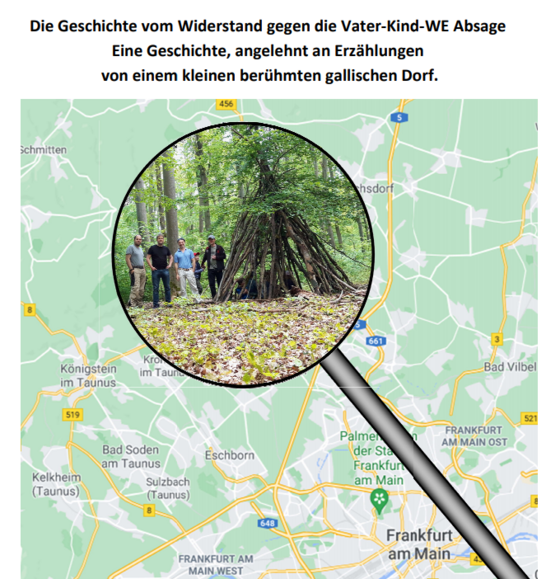 Wir schreiben das Jahr 21 nach Millennium. Das ganze Grenzgebiet des Limes ist von Corona besetzt. Alle Veranstaltungen werden abgesagt. Alle Veranstaltungen? Nicht ganz, da gibt es eine kleine Gruppe von Papas mit Kindern, die sich an einem Tag, an einem Ort getroffen haben, an dem es offiziell erlaubt war, und die damit auf ihre Art den Absagen Widerstand geleistet haben. Gebaut wurden die Familien-Lager Albrechtaneum, Hussockium, Garoffanium und Stangenium, um ein bestimmtes Haus-H herum. Nun bildet sich ja bekannter Weise in Frankfurt gerade ein Grün geführtes Regierungsbündnis, und daher bekommen Einfamilienhaussiedlungen im „Speckgürtel“ keine Baugenehmigungen mehr. Man entschied sich daher ganz im Stile der Frankfurter Skyline eher für eine Mehrfamilienbauweise. So trafen sich 11 unerschrockene Baumeister an einem warmen Samstag im Frühling, um ganz traditionell wie bisher immer beim Vater-Kind-WE zum Geländespiel den Nachmittag im Wald zu verbringen. Alle waren mit Feuereifer dabei, schleppten Äste und Zweige in allen Formen, Längen, Dicken und Farben herbei, und errichteten um einen schönen schiefen Baum herum ein Tippi, das Platz für alle Kinder bot, und daher seinen Namen wirklich zu Recht trug. Nach der anstrengenden Bauphase wurde dann statt der Wände erstmal das mitgebrachte Picknick verputzt. Als 2. Programmpunkt stand natürlich Stockschnitzen auf dem Programm. In gewohnter Begeisterung und bedingt durch die Erfahrungen der professionellen Schnitzer, wurde es von allen bis auf einen kleinen Schnitt in den Finger unfallfrei absolviert. Ein Besuch bei ein paar „Nachbar“-Tippis führte vorbei an den Mammutbäumen. Hier stellte sich heraus, dass 7 Kinder im Alter von 4 bis 8 Jahren nicht ausreichen, um Fingerspitze an Fingerspitze den vollen Baumumfang dieser Giganten des Waldes in ca. 1m Höhe zu umfassen. Ebenfalls nicht erfolgreich war die Truppe dabei ohne neumodische Hilfsmittel ein Feuer zu entzünden, obwohl der mitgebrachte Feuerstein wirklich bei jedem Kind brav kleine Funken springen ließ. Da aber eh keine Würstchen oder gar die ebenfalls sehr beliebten Marshmallow im Gepäck mitgeführt wurden, wurde der Programmpunkt „grillen“ kurzerhand übersprungen. So versammelte man sich am Ende des Tages noch am Spielplatz, wo auch dieses Abenteuer des kleinen rebellischen Dorfes zu Ende ging. Natürlich mit dem traditionellen Festmahl, welches von Nachzügler Patrix Göbelunium mitgebracht worden war. Und als alle so beieinander standen, entstanden schon Pläne für weitere Aktionen, wie z.B. der Bau einer Brücke über einen Bach und …, aber das ist eine Geschichte für ein anderes Mal. Die Handlung und alle handelnden Personen sind nicht ganz frei erfunden, und jegliche Ähnlichkeit mit real existierenden Personen ist auch nicht ganz zufällig. Ihr glaubt die Geschichte trotzdem nicht? Dann geht hin und schaut selbst, das Tippi steht bei 50°13.46N / 8°33.17E. Autor: Hendrik Stange