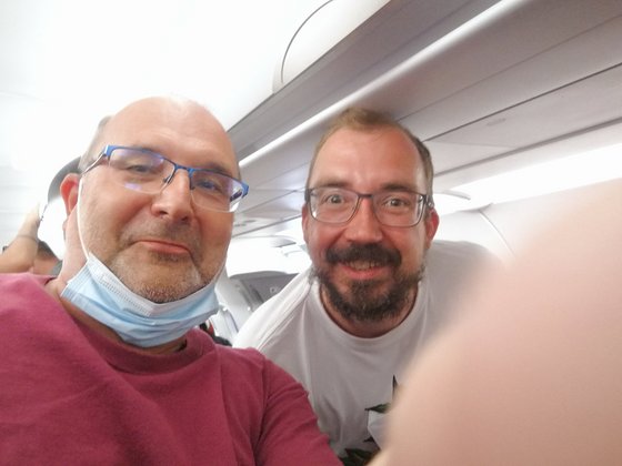 Sascha Socke und Hans-Conrad Blendermann treffen sich auf dem Rückflug von Andalusien nach Frankfurt auf dem Condorflug hoch über den Wolken.