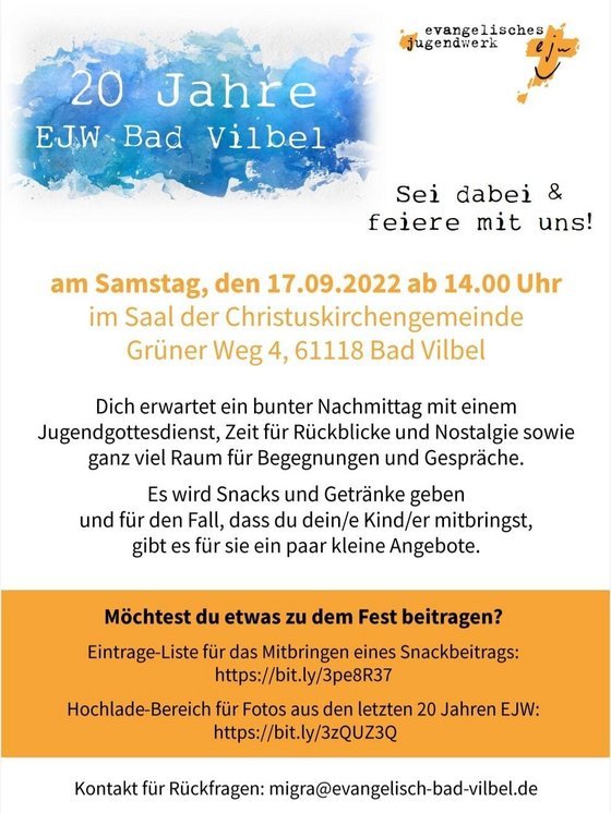 Sei dabei und feiere mit uns! Am Samstag, den 17. September ab 14 Uhr im Saal der Christuskirchengemeinde in Bad Vilbel, Grüner Weg 4. Dich erwartet ein bunter Nachmittag mit Jugendgottesdienst und ganz viel Zeit für Rückblicke und Begegnungen. Alle Infos findest du auf dem Flyer.