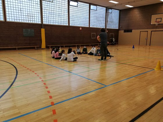 AG Sport, Spiel, Spannung - Angebot des EJW in der Kerschensteiner Grundschule in Hausen. Was an vielen Stellen im Moment nicht möglich ist, ist in der Grundschule noch erlaubt. Sport und Spiel in der Turnhalle, allerdings mit Maske. Aber die Verantwortlichen in der Schule für die Betreuung am Nachmittag und die Kinder sind dankbar. Sie können sich bewegen, rennen, spielen und sind begeistert dabei. Zwischendurch gibt es immer mal wieder Pausen, denn Bewegung mit Maske ist anstrengend. Dann unterhalten wir uns und reden auch darüber, wie wichtig teilen und helfen ist. Nicht nur, aber gerade auch in Zeiten von Corona. Auf dem Bild seht Ihr Lukas, den Ehrenamtlichen, der die AG unterstützt und die Kids. Hans-Conrad Blendermann