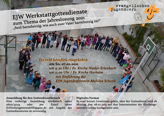 Die Ev. Kirchengemeinde und die Ev. Kirchengemeinde Harheim laden herzlich zu den EJW Werkstattgottesdiensten am Sonntag, den 07.02.2021 um 9.30 Uhr in Nieder-Erlenbach und um 11.00 Uhr in Harheim ein.