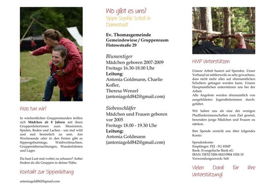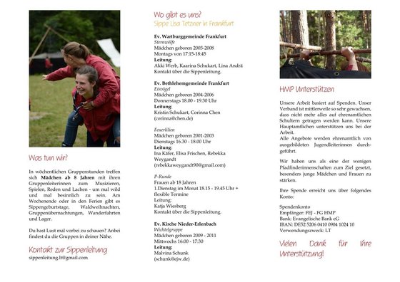Gruppenarbeit ist wieder möglich und wir laden alle Mädchen und jungen Frauen wieder zur Gruppenarbeit in Präsenz ein. Anbei findet ihr die Informationen zu unserer Gruppenarbeit an den verschiedenen Standorten in Hessen: Frankfurt, Friedrichsdorf/ Seulberg, Oberstedten, Butzbach und Darmstadt. An den Sippenstandorten der Sippe "Maria Sibylla Merian" in Wiesbaden und der Sippe “Elsa Brändström” in Gießen können wir leider aktuell keine Gruppenarbeit anbieten. Für Fragen steht Euch die jeweilige Gruppen- und Sippenleitung gerne zur Verfügung. Alle Daten findet ihr in den Flyern.