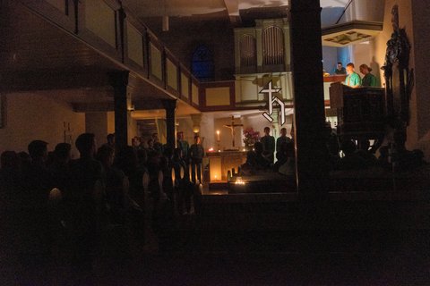 Abgerundet wurde das sehr nasse, aber abwechslungsreiche Lager von der ausgesprochen feierlichen Pfadfinderernennung in der evangelischen Kirche in Langenhain Ziegenberg. Unser Leitender Stammesführer Jo Schlüter konnte krankheitsbedingt nicht am Pfingstzeltlager teilnehmen. Daher wurde die Ernennung und das Ablegen des Pfadfinder-Verspruches durch die verschiedenen Stammesführer durchgeführt und Jo richtete per Audiobotschaft seine Worte an die frisch ernannten Pfadfinder. Der Gottesdienst zu den Ernennungen wurde durch die Orgel begleitet, was der Zeremonie einen sehr andächtigen Ausdruck verlieh. Im Anschluss wurde dann die Pagode durch unseren diesjährigen Speermeister Matthias Rößler entzündet, welche noch lange den Platz mit Flammenschein erhellte.