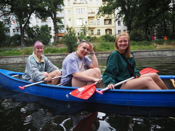 Nicht nur, dass es direkt im Zug große Verwirrung gab, wer auf welchen Platz sitzen sollte – nein! – es stellte sich auch noch das sonnengelbe Gemeindehaus, in dem wir wohnen sollten, als ein entlegenes Domizil ganz im Süden Berlins heraus. Am Ende einer Linie, die in jeder Ferienzeit mit Schienenersatzverkehr angefahren wird. Trotzdem konnten wir uns nach einer kurzen Verzögerung gemütlich in unserer neuen Heimat einrichten. Schon im Vorfeld hatten wir festgestellt, dass wir (nahezu) vegetarisch unterwegs sein würden und genossen seitdem zahlreiche vegane und fleischlose selbstgekochte Gerichte: Burger, gefüllte Paprika und eine bunte Reispfanne wurden von unserer 14-köpfigen WG zubereitet. Aber auch außerhalb des Hauses fand einiges an Programm statt: Die Gedenkstätte Hohenschönhausen wurde zwischen zahlreichen Shoppingstunden und einer Kanutour auf der Spree besucht. Und auf den langen Wegen mit den öffentlichen Verkehrsmitteln fielen wir immer wieder durch gute und laute Laune, sowie einigen Gesangseinlagen auf. Bei uns brechen die letzten Tage an und wir werden die ruhigen Abendandachten, langen Frühstückszeiten und unsere geniale Gruppe bald schon vermissen. Bis dahin sagen wir NEIN zu Mückenstichen, JA zum Sturmstillungsrezept und freuen uns morgen den CSD zu besuchen. Beste Grüße Eure Berlin-Großstadt-WG Leitung: Britta Meyer und René Eisenacher