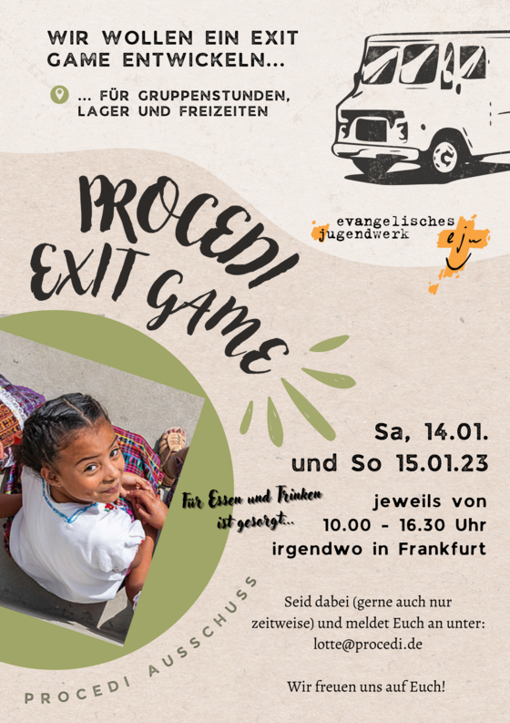 Wir möchten ein PROCEDI Exit Game für Gruppenstunden, Lager und Freizeiten entwickeln. Am Samstag, den 14.01.2023 und Sonntag, den 15.01.2023 jeweils um 10.00 – 16.00 Uhr in einem Gemeindehaus in Frankfurt.