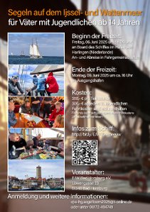 Das EJW Bad Homburg veranstaltet für Väter mit Jugendlichen vom 6. Juni bis zum 9. Juni eine Segelfreizeit auf dem Ijssel- und Wattenmeer. Eingeladen sind Väter mit Jugendlich (ab 14 Jahre). Auf einen großen Zweimaster mit 32 Kojen werden Väter mit den eigenen Kindern Zeit verbringen, gemeinsam die Natur erleben, neue Kontakte und Begegnungen haben, sich über Gott und die Welt unterhalten und zeigen, dass ein Vater-Teenager-Team auch ohne mütterliche Hilfe die Probleme des täglichen Lebens meistern kann. Anpacken beim Segeln unter Anweisung des Kapitäns und eines Bootsmanns sind selbstverständlich. Das Kochen wird von den Teilnehmern organisiert. Die Teilnehmer müssen gute Schwimmer sein (mindestens Freischimmer). Die An- und Abreise erfolgt in Fahrgemeinschaften mit Pkw. Die PKW können während des Törns auf einem gesicherten Parkplatz in der Nähe am Liegeplatz gegen Entgelt untergestellt werden. Die Anreise ist so zu organisieren, dass man spätestens am Freitag gegen 20.00 Uhr i m Hafen von Harlingen eintrifft. Die Rückreise erfolgt am Pfingstmontag am späten Nachmittag von Harlingen aus. Die Kosten betragen 355 € € pro Teilnehmer ohne Fahrtkosten für Hin- und Rückreise. Ab dem zweiten Jugendlichen einer Familie beträgt der Teilnehmerbeitrag 305 €. Der Endpreis kann sich reduzieren, falls mehr als 28 Teilnehmer. Am Sonntag, den 26. Mai um 18 Uhr findet ein Vortreffen statt.