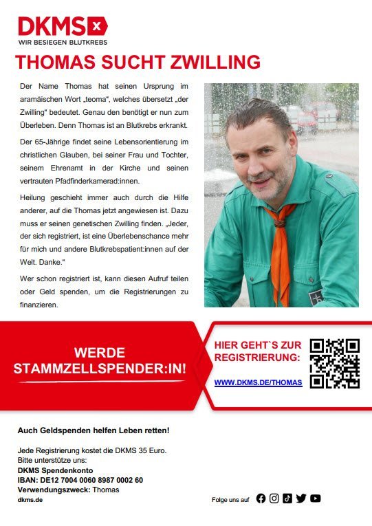 Heilung geschieht immer auch durch die Hilfe anderer, auf die Thomas jetzt angewiesen ist. Dazu muss er seinen genetischen Zwilling finden. „Jeder, der sich registriert, ist eine Überlebenschance mehr für mich und andere Blutkrebspatient:innen auf der Welt. Danke.“ Wer schon registriert ist, kann diesen Aufruf teilen oder Geld spenden, um die Registrierungen zu finanzieren.