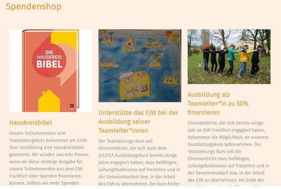 Ehrenamtliche, die sich bereits einige Jahre im EJW Frankfurt engagiert haben, bekommen die Möglichkeit, an unserem Teamleitungskurs teilzunehmen. Der Teamleitungskurs soll die Ehrenamtlichen dazu befähigen, Leitungsfunktionen auf Freizeiten und in den Gemeinden vor Ort sowie in der Arbeit des EJWs zu übernehmen. Ziele dieser Ausbildung sind unter anderem, das Kennenlernen von Methoden zum Erfassen von Gruppenprozessen, das Auseinandersetzen mit der Entwicklung der eigenen Leitungsrolle und die Aneignung von Methoden ihrer eigenen Leitungsaufgaben. Am Ende der Ausbildung werden die Ehrenamtlichen feierlich bei den jeweiligen Jahrestreffen zur*zum Jugendleiter*in im EJW berufen. Als kleines Dankeschön für ihr Engagement und für die Unterstützung ihrer Leitungsfunktionen, bekommen sie eine Hauskreisbibel geschenkt. Diese Bibeln kosten jeweils ca. 40 EUR. Wir würden uns sehr freuen, wenn wir diese wichtige Ausgabe für unsere Teilnehmenden aus dem EJW Frankfurt über Spenden finanzieren könnten. Wir haben für den Teamleitungskurs 2022 einen Spendenshop erstellt. Dort können Sie eine Hauskreisbibel „kaufen”, einen Teilnehmenden bei seinem Kursbeitrag oder das EJW Frankfurt für diese Ausbildung unterstützen. Hier geht es zum SPENDENSHOP. Frauke Rothenheber EJW Frankfurt, Fundraising und Netzwerken