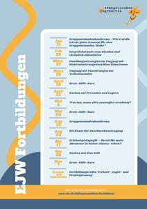 Wir bieten ein vielseitiges Angebot an praxisnahen Fortbildungen für Ehren- und Hauptamtliche in der verbandlichen und kirchlichen Kinder- und Jugendarbeit an. Themen sind kreative und methodische Gestaltung von Gruppenstunden, erlebnispädagogische Ansätze, der Austausch über Glaubensfragen sowie der sensible Umgang mit herausfordernden Situationen, sowie wichtige Grundlagen wie Erste-Hilfe-Kurse, Angebote rund um Freizeiten, Kochen für Gruppen sowie Fortbildungen zur Projekt- und Zuschussbeantragung. Die meisten der Fortbildungen sind zur Verlängerung der JuLeiCa geeignet. Diese sind mit dem Juleica Logo gekennzeichnet.